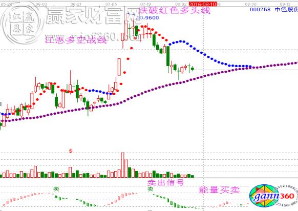 如圖,000758中色股份,在10.96的高點(diǎn)處,極反通道剛好運(yùn)行到紅色外軌線(xiàn)的波段壓力,上漲趨勢(shì)受阻應(yīng)賣(mài)出為主;同時(shí),江恩多空展現(xiàn)工具跌破短線(xiàn)多頭線(xiàn),趨勢(shì)轉(zhuǎn)弱;再看下方的能量買(mǎi)賣(mài),紅柱縮短出現(xiàn)賣(mài)出信號(hào)。3個(gè)趨勢(shì)工具都顯示10.96處的上漲趨勢(shì)告一段落,空頭占優(yōu),理應(yīng)賣(mài)出為主;而當(dāng)前極反通道回撤到生命線(xiàn)支撐附近,多空戰(zhàn)線(xiàn)回撤到紫色多頭線(xiàn)的支撐,而能量買(mǎi)賣(mài)綠柱縮短,趨勢(shì)都在顯示走好,則應(yīng)做分批買(mǎi)入。