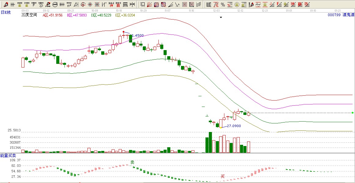 酒鬼酒用三度空間12.04日發(fā)出黃色見底信號(hào),一路突破了E區(qū)沒以前處于D區(qū)壓力位置