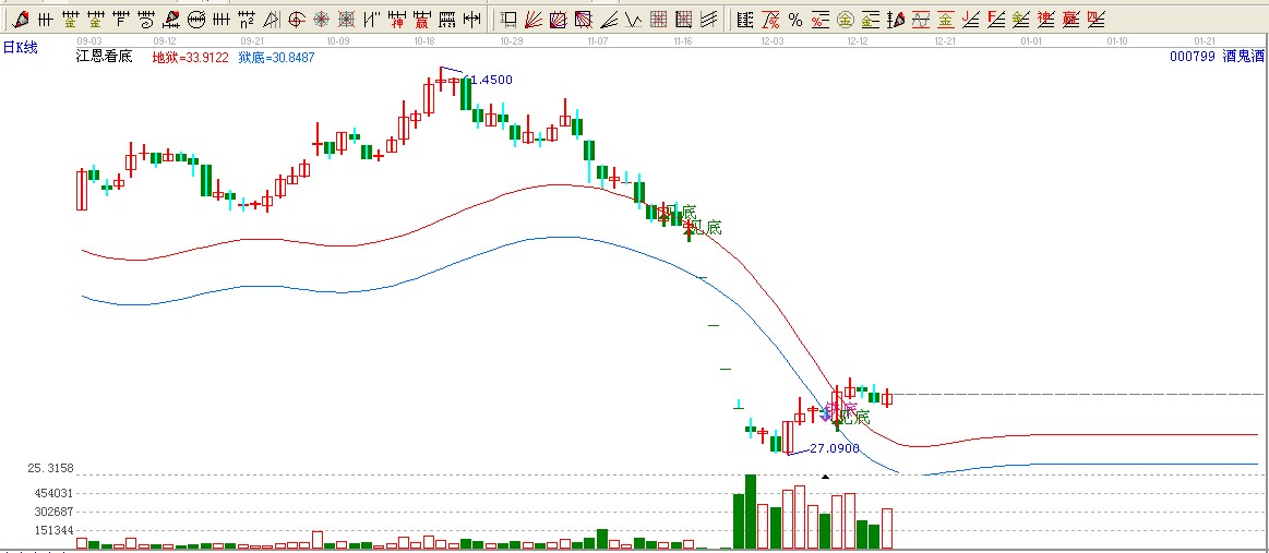 酒鬼酒用江恩看低工具在12.07日發(fā)出鐵底信號(hào),觸及獄底在12.10日發(fā)出了見底信號(hào)一路上攻地獄上方開始了大躍進(jìn)。