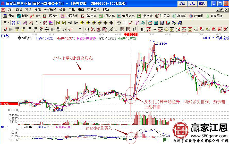 如圖聯(lián)美控股(600167)從2011年初到5月初的股價走勢,前期的走勢一直處于震蕩調(diào)整的形態(tài),形成的走勢是“北斗七星”的K線形態(tài),可以看出,股價沿著均線向上拉升,第一個突破買點,之后回踩不破前期買點,股價向上拉升,在形成底部的適合,七星的均線向上分散,同時長陽線突破買點,是最佳的一個買入點位,投資者可以進行詳細的分析。
