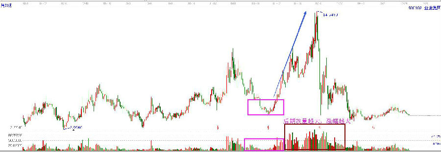 成交量圓弧底形成預(yù)示著上漲行情的來臨,而圓弧底成型之后的成交量大小則決定著后市行情的大小,如果成交量圓弧底之后的成交量大,則行情強(qiáng),漲幅大;如果成交量圓弧底之后成交量小,則行情弱,漲幅小。