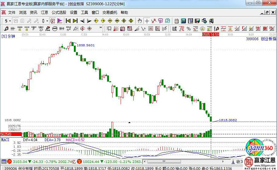 看完了籌碼上的分析之后,我們?cè)诳磩?chuàng)業(yè)板的5分鐘走勢(shì)圖。下圖中最強(qiáng)紅色路線,開盤直接上攻,拿下1833不拖泥帶水,回踩不破1814,此后具備線段反彈上攻的能力,上面壓力位是1840。