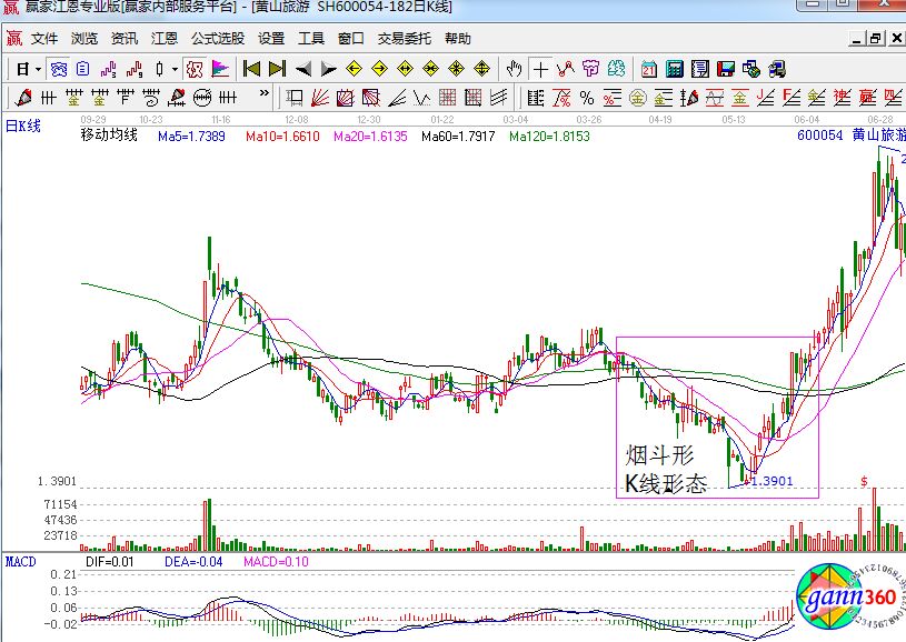 該股是黃山旅游的走勢變化,從上圖中我們可以看到該股在前面的走勢中股價(jià)均處于橫盤針對哪個(gè)的i刑天,在這個(gè)期間,主力是在不斷的吸籌的,目的就是為了拉升股價(jià)做準(zhǔn)備,終于在一段盤整之后出現(xiàn)了下跌的走勢,并且創(chuàng)出了股價(jià)的新股,形成了煙斗形的底部,這個(gè)時(shí)候就預(yù)示著行情的反轉(zhuǎn)變化。