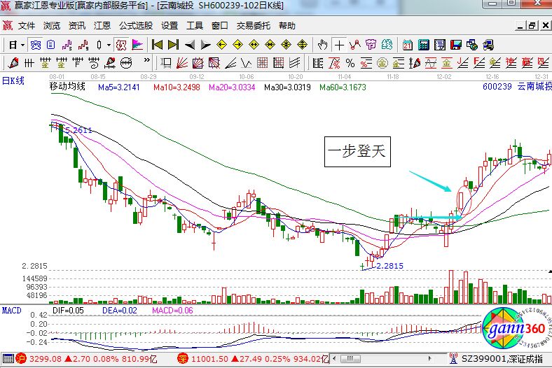 股票一步登天形態(tài)指的就是:股價(jià)在上升通道或者持續(xù)下降企穩(wěn)的過程中,前一日收出了一根縮量的十字星或者小實(shí)體星,次日放量收出中陽線,量能是前期1到5倍之間,直奔漲停的走勢(shì)是更好的,在具體的實(shí)戰(zhàn)中,最好是在20日線、60日線穩(wěn)步向上的走勢(shì)。接下來我們來看云南城投走勢(shì)圖。
