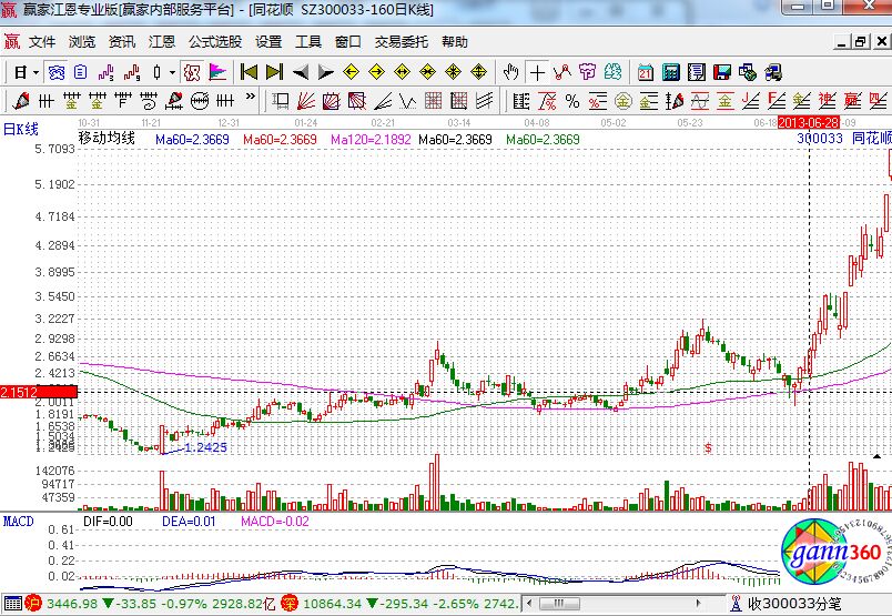 上圖是同花順在2013年部分走勢(shì)圖,從上圖我們可以看到該股在5月份的時(shí)候突破60日均線走出了一波很有力度的上漲行情,6月份隨大盤該股出現(xiàn)補(bǔ)跌,月底啟穩(wěn)在60日均線附近,經(jīng)過(guò)1周時(shí)間的整理,6月28日該股出現(xiàn)向上突破趨勢(shì),此時(shí)出現(xiàn)很好的短線買點(diǎn),隨后一路放量上漲,連續(xù)暴拉,截止到最后一根陽(yáng)線的話有80%以上的漲幅,牛股風(fēng)采盡顯。