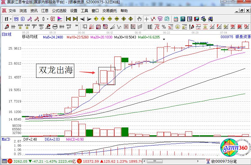 上圖是銀泰資源在2001年6月初的走勢圖,圖中該股已經(jīng)正式步入了主升段中,漲幅是驚人的,當(dāng)時是該股還是電力股的領(lǐng)頭羊,在6月11日的時候,該股的股價已經(jīng)遠(yuǎn)離了5天均線,這個時候,莊家為了進(jìn)一步控股該股的上升基礎(chǔ)和達(dá)到震倉的目的就采取了震倉手法,在6月12日的時候,該莊家突然令該股巨量大幅低開,迅速嚇出跟風(fēng)盤,然后又迅速上拉,和前一天的陽線共同組成了雙龍出?,F(xiàn)象。