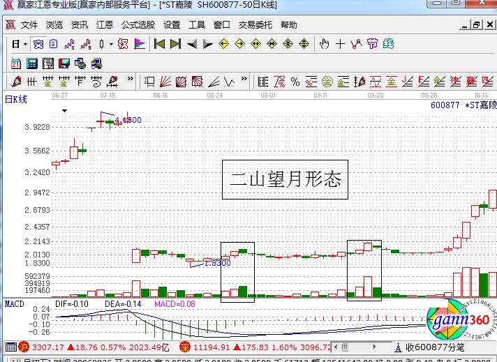 圖中前兩次的放量好像是兩座的小山峰,第三次放量之后便開始大漲,這樣就形成了二山望岳的走勢(shì),顯然暗示這二峰已經(jīng)過了,大漲序幕即將拉開。