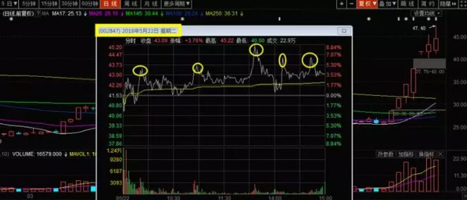 D點(diǎn)介入之后的賣(mài)點(diǎn)在哪里呢?我們繼續(xù)看圖,編號(hào)G的那筆陽(yáng)線大家看出什么端倪了嗎?也就是2018年5月22日,收了一根上下影線均較長(zhǎng)的K線,不得不使我們要懷疑主力的企圖。再來(lái)看那一天的分時(shí)圖。