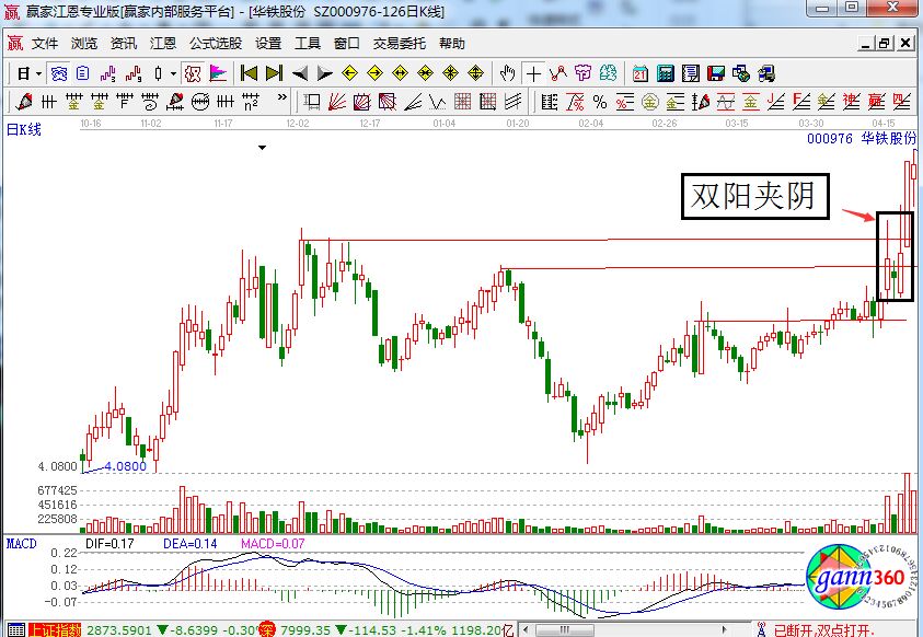 雙陽(yáng)夾陰形態(tài)在使用過(guò)程中,有一句口訣,它就是:雙陽(yáng)夾陰漲勢(shì)多,騎墻過(guò)線看多頭;后量超前真信號(hào),青云白鶴樂(lè)悠悠。具體來(lái)說(shuō)怎么樣應(yīng)用?下面我們打開股票軟件來(lái)看000976的走勢(shì)圖。
