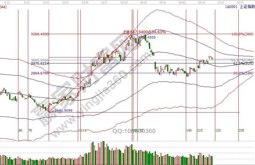 A股3、4號時間窗口及3051-3065極反通道多周期共振反壓位,時間與空間的解讀在6月28號及1號在分析中有闡述,同時今天收盤價(jià)3015與工具測算位置僅僅相差一個點(diǎn)。目前短周期的周期共振警示還沒有解除,2號盤中在贏家江恩系統(tǒng)學(xué)員區(qū)已談到共振會引起傳遞,目前市場正在按預(yù)期逐級回踩確認(rèn)短期生命線,回撤期間有參考意義的位置是60分鐘生命線,贏家學(xué)員們可以結(jié)合工具盤中跟蹤等待信號確認(rèn)。整體上工具還未給出反彈結(jié)束信號,同時這里也不具備大幅開倉條件,提高止賺位保持一定持倉做應(yīng)對,7月4號盤中壓力是135度3055點(diǎn)、90度3036點(diǎn),盤中支撐是0度2997點(diǎn)、315度2978點(diǎn)。操作策略,指數(shù)極反通道生命線上安全區(qū)域震蕩上攻,反彈動作還在延續(xù),3051-3067區(qū)間附近高倉位可以分批兌現(xiàn)利潤,整體持倉保持3-5成。