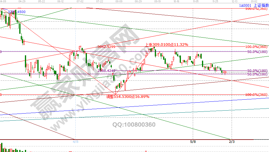 指數(shù)早盤觸及江恩箱3/8空間分割位2870點止跌,全天圍繞下降1*1線震蕩,隨著時間窗6號臨近,市場盤中震幅收斂到極致方向選擇在即,空間上,指數(shù)向上突破3*2線2914點則順勢做多,反之如跌破2870點快速下行挖坑,在江恩箱2*1線2810支撐尋找機會,5、6號兩個交易日重點跟蹤方向選擇,跟隨市場做好倉位應對。5號盤中壓力2894、2911點,盤中支撐2860-2870位置。操作策略,指數(shù)生命線下弱勢區(qū)域,倉位控制在3成,穩(wěn)健者重點關注12月6號時間窗口機會。