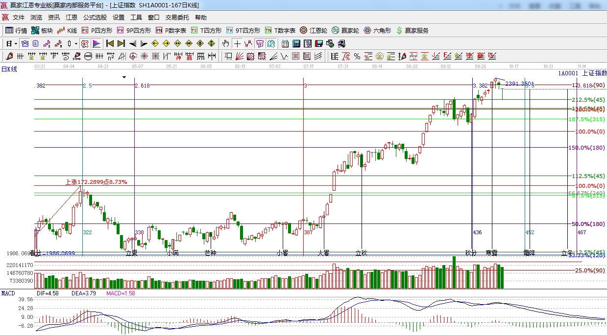 ☆依據(jù)贏家江恩系統(tǒng)黃金時(shí)間周期線提示:10月9日以及寒露時(shí)間節(jié)點(diǎn)之后,指數(shù)重心下移,短期可能將要調(diào)整幾天了,下一時(shí)間窗口10月22日。