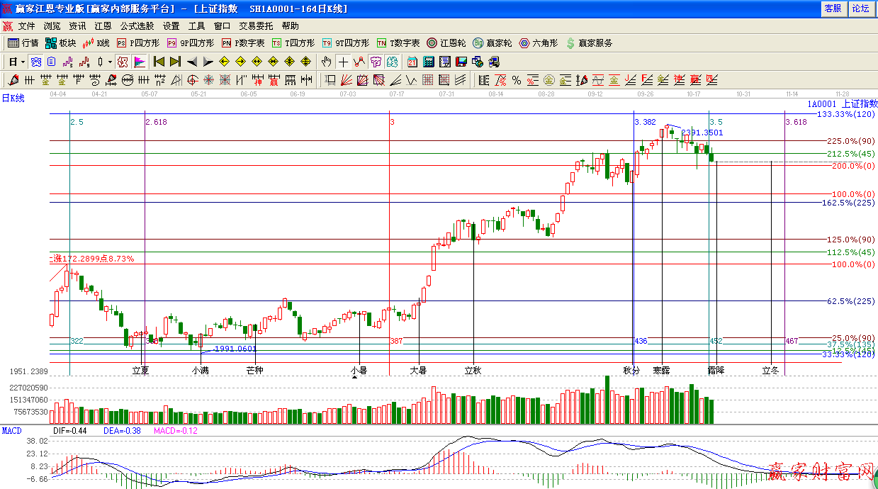 江恩看盤綜述:依據(jù)贏家江恩技術(shù)工具分析得出:周三上證如期反抽2350附近,隨后由于量能不支展開回落,明今日是霜降節(jié)點(diǎn),預(yù)計(jì)今日指數(shù)或?qū)⑿》降缀蠡爻椋路街谓?度位置2318附近,生命線2290附近。操作上,嚴(yán)格控制倉位,考慮進(jìn)行高拋低吸打差價(jià)。