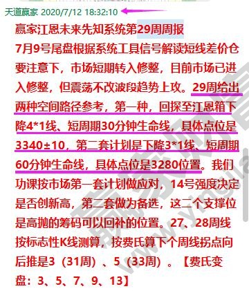 7月12號贏家江恩VIP學(xué)員周報內(nèi)容如下圖,本周第一種路徑關(guān)鍵位3340±10,第二種路徑關(guān)鍵位3280點。7月14號午盤分析對關(guān)鍵位再度進(jìn)行解讀。