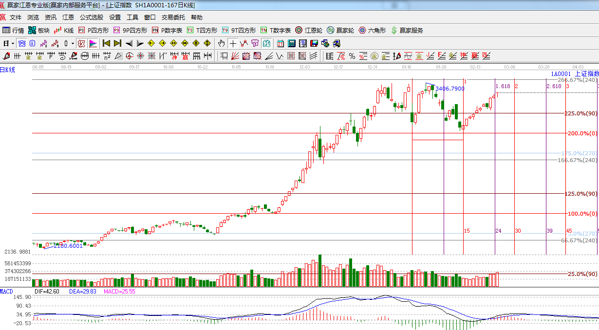 ★依據(jù)贏家江恩理論系統(tǒng)波段百分比提示:短期上方阻力位是江恩百分比240度,3436點,270度,3486點,支撐90度3188點。