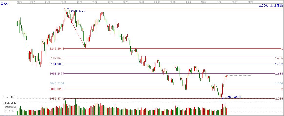 綜上所述:大盤處于極反通道生命線2063附近,上方黃金價格延伸線1.618壓力2100.短期圍繞極反通道震蕩為主。
