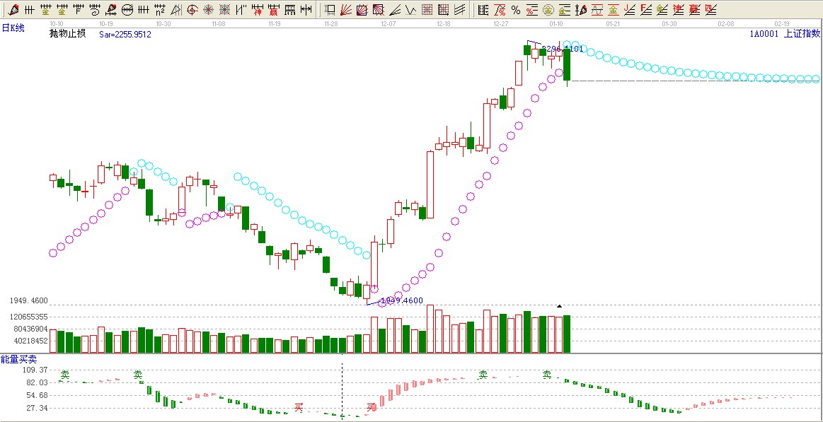 ☆依據(jù)贏家拋物止損提示:大盤拋物止損粉紅色變?yōu)榫G色,看空。