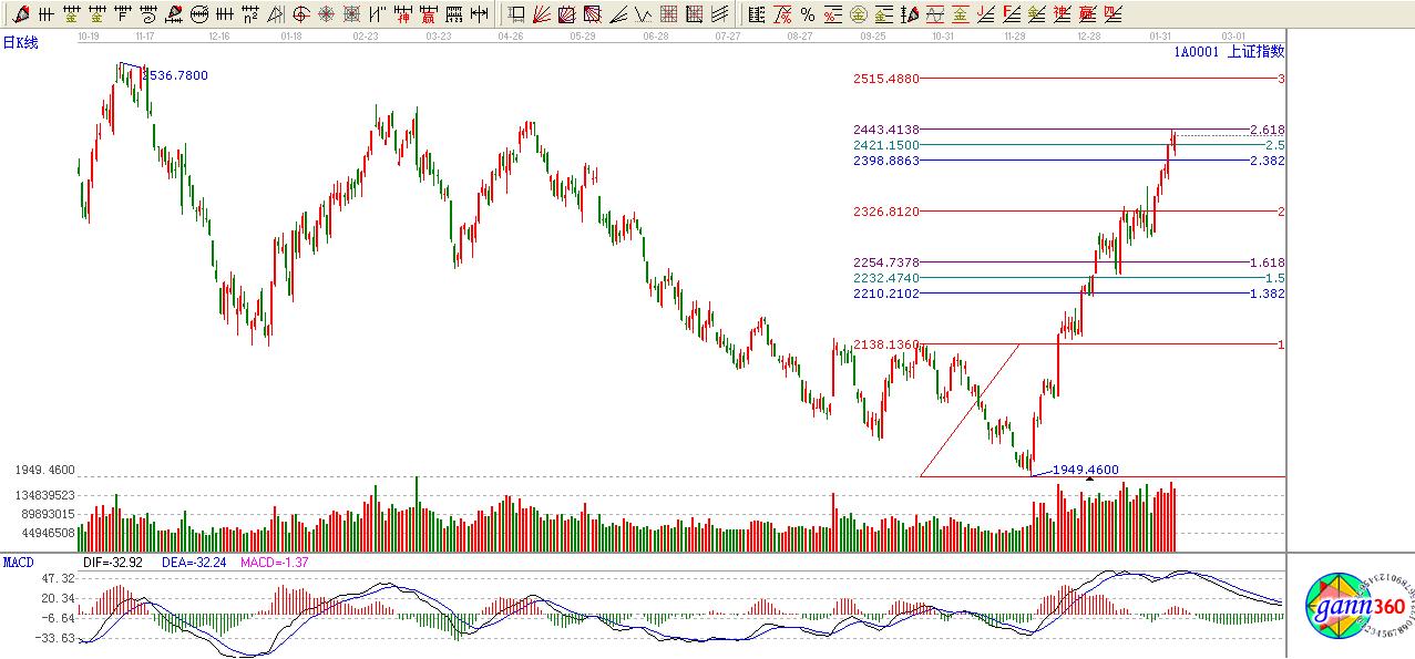 綜上所述:大盤極反通道藍色上軌位置不破,按照極反通道應用法則看高一線至2457點,短期黃金分割2.382/2.618位置震蕩難免。