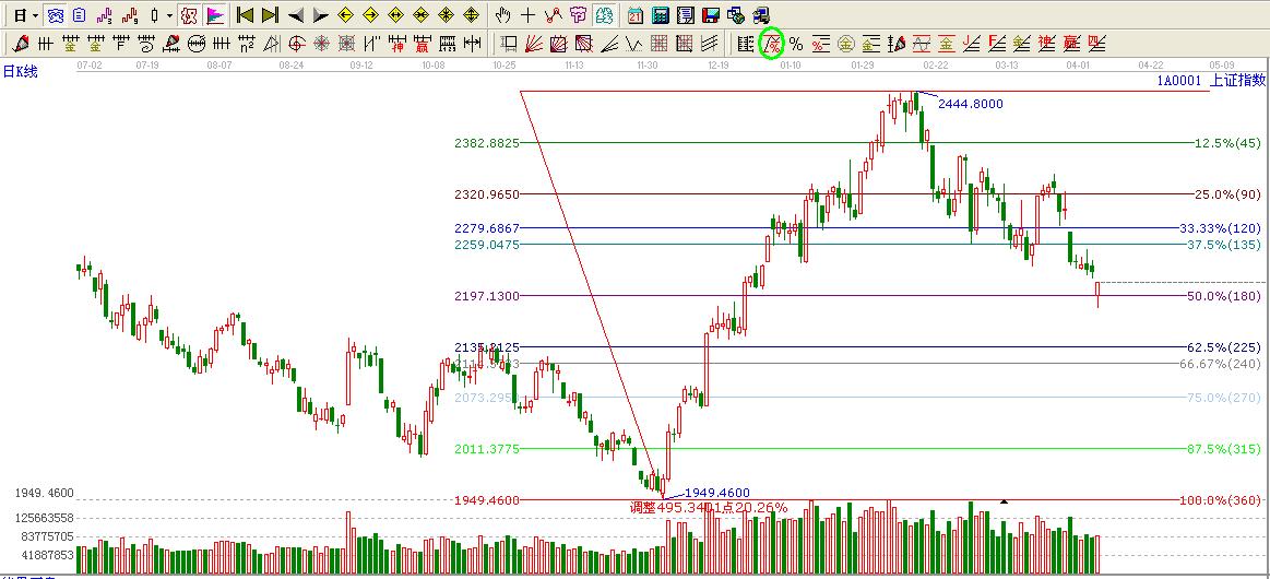 ★依據贏波段百分比提示:大盤1949.46點至2444.80點回調目前處于180度位置2197.13點,這里不破看高一線至135度位置2259.04點