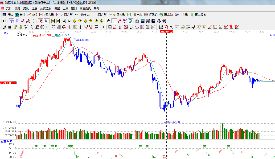 ☆依據贏家江恩系統(tǒng)能量買賣提示:多空轉換節(jié)點位置,等待信號的確認;