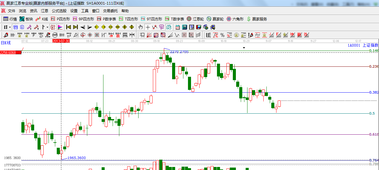 ★依據(jù)贏家江恩系統(tǒng)波段百分比延伸提示:黃金分割價格圖0.5位置是2090,0.382位置是2049;