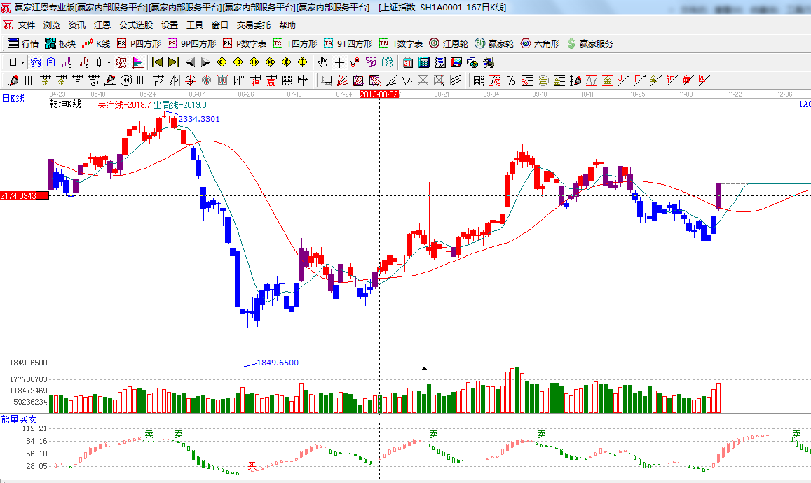 ☆依據(jù)贏家江恩系統(tǒng)乾坤K線提示: 藍(lán)色轉(zhuǎn)為紫色K線,等待買入紅色信號(hào);