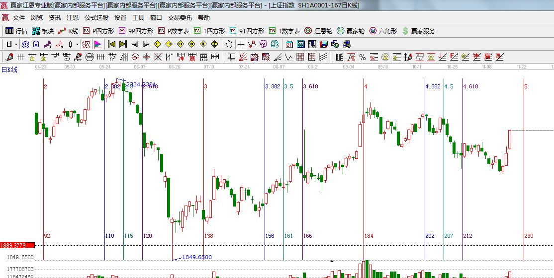 ★依據(jù)贏家江恩系統(tǒng)黃金時(shí)間周期線提示:22號(hào)是重要時(shí)間窗,觀察生命線上量能變化;