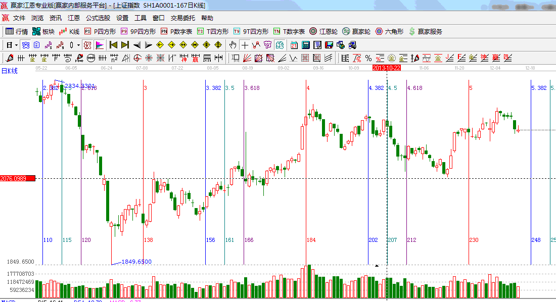 ☆依據(jù)贏家江恩系統(tǒng)波段百分比提示:跌破62.5%與66.67%區(qū)間,50%的位置是2150;