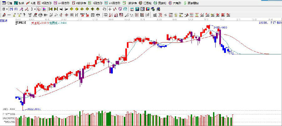 ★依據(jù)贏家江恩理論系統(tǒng)乾坤K線提示:紅色關(guān)注線之下,k線由紫色轉(zhuǎn)變?yōu)樗{(lán)色線,依據(jù)規(guī)則,趨勢(shì)空頭。
