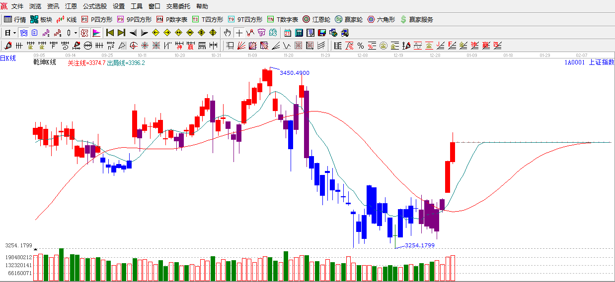 ★依據(jù)贏家江恩理論系統(tǒng)乾坤K線提示:紅色關(guān)注線之上,出現(xiàn)紅色k線,依據(jù)規(guī)則,趨勢(shì)轉(zhuǎn)多。
