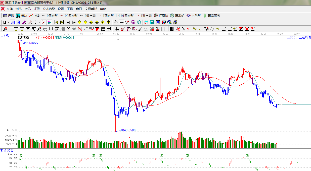 ☆ 依據(jù)贏家江恩系統(tǒng)乾坤K線提示: 目前處于藍(lán)色區(qū)域,出局線下方,穩(wěn)健者不建議操作,等待為主,