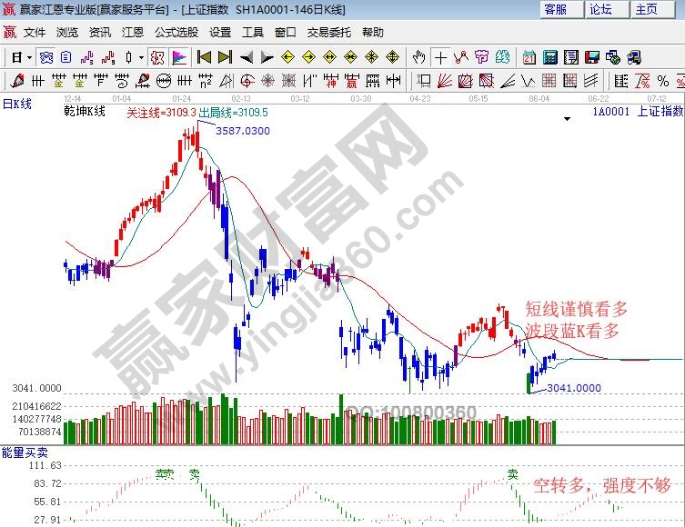 ☆依據(jù)贏家江恩理論系統(tǒng)乾坤K線提示:藍色K線代表波段休息,收盤保持在短期出局線3100點上方,短線謹慎看多波段看空。