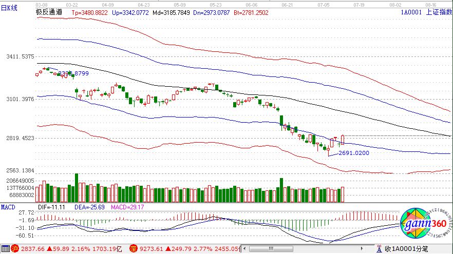 滬指漲2.16%,報(bào)2837點(diǎn);深成指漲2.77%,報(bào)9273點(diǎn);創(chuàng)業(yè)板指漲3.30%,報(bào)1614點(diǎn)。盤(pán)面上看,5G、富士康概念、半導(dǎo)體、量子通信、集成電路、芯片等板塊漲幅居前。滬股通凈流入17億,深股通凈流出2.7億。相應(yīng)的極反通道指標(biāo)的支撐壓力提示,如下圖所示: