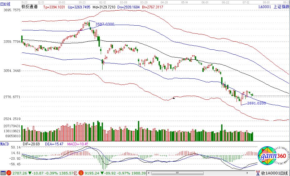 滬指跌0.39%,報(bào)收2787點(diǎn);深成指跌0.97%,報(bào)收9195點(diǎn);創(chuàng)業(yè)板跌0.85%,報(bào)收1607點(diǎn)。從板塊漲幅上看,啤酒、旅游、紡織、電力改革、在線旅游、半導(dǎo)體、PCB概念等漲幅居前;通信設(shè)備、鈦白粉、高送轉(zhuǎn)、無線充電、芯片、海南、知識(shí)產(chǎn)權(quán)保護(hù)等板塊跌幅居前。滬股通凈流入1.2億,深股通凈流出1億。相應(yīng)的極反通道指標(biāo)的支撐壓力提示,如下圖所示: