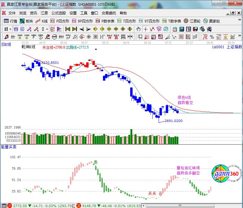江恩看盤綜述:通過(guò)贏家江恩系統(tǒng)趨勢(shì)、時(shí)間、價(jià)格工具綜合評(píng)判市場(chǎng)一星看多(五星評(píng)級(jí)標(biāo)準(zhǔn))。滬指日線依托極反通道藍(lán)線下軌線震蕩,7月6號(hào)最低點(diǎn)2691點(diǎn)對(duì)應(yīng)的是月線藍(lán)色下軌線,周線藍(lán)色下軌線是2640附近,周、月線的下軌線走平,在一定程度上限制了下行的空間;短周期15、30、60分鐘均處于生命線下弱勢(shì)通道,單從K線位置而言,懸空可上可下狀態(tài),20號(hào)早盤11點(diǎn)是日內(nèi)時(shí)間窗,15分鐘生命線是2787點(diǎn),對(duì)應(yīng)藍(lán)色下軌線中2750附近,明日觀察時(shí)間窗與價(jià)格的有關(guān)系,遵循線上支撐線下阻力原則。