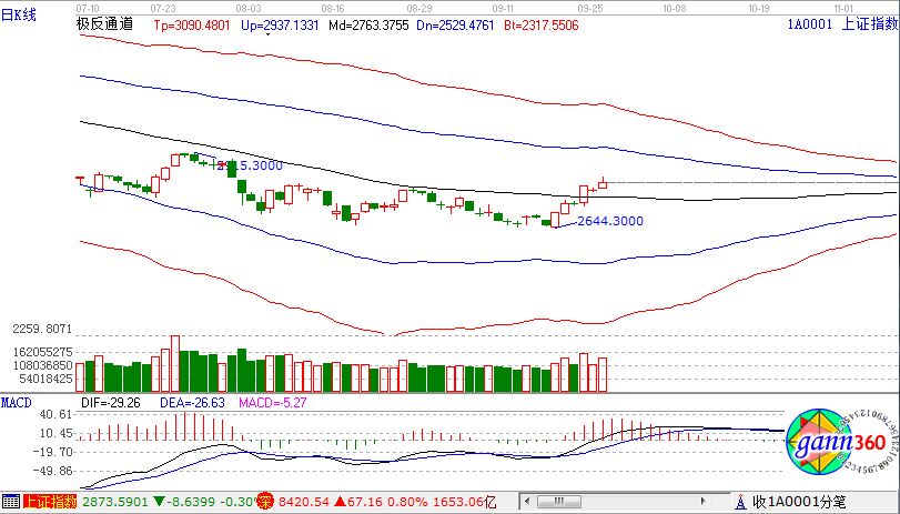 滬指漲0.92%,報收2806點;深成指漲0.80%,報收8420點;創(chuàng)業(yè)板漲1.06%,報收1420點。從盤面上看,物流、白酒、食品飲料、醫(yī)藥商業(yè)、油改、醫(yī)療器械等板塊上漲;種植業(yè)、氟化工、足球概念、互聯(lián)網(wǎng)彩票、鈦白粉、知識產(chǎn)權(quán)保護、軍工等板塊跌幅居前。滬股通凈流入15億,深股通凈流入6億。相應(yīng)的極反通道指標(biāo)的支撐壓力提示,如下圖所示: