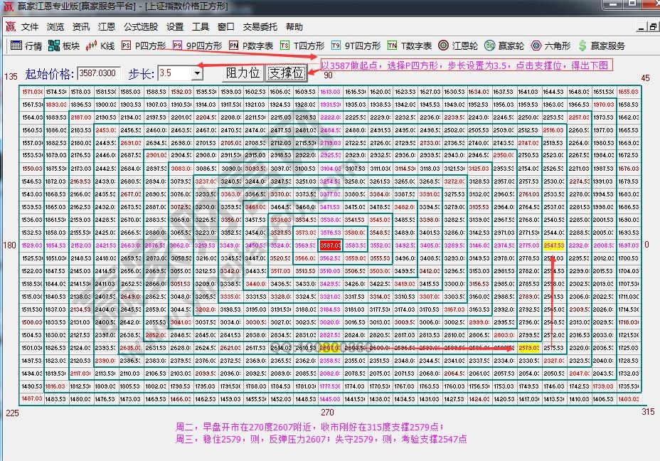 ☆依據(jù)贏家江恩理論系統(tǒng)江恩價格四方形提示:以3587為起點,做江恩價格四方形圖。周二,指數(shù)早盤開在2609點,剛好處于270度2607附近。全天震蕩走低,剛好收在315度2579點。周三,穩(wěn)住2579,反彈壓力看2607;失守2579,將考驗支撐2547。