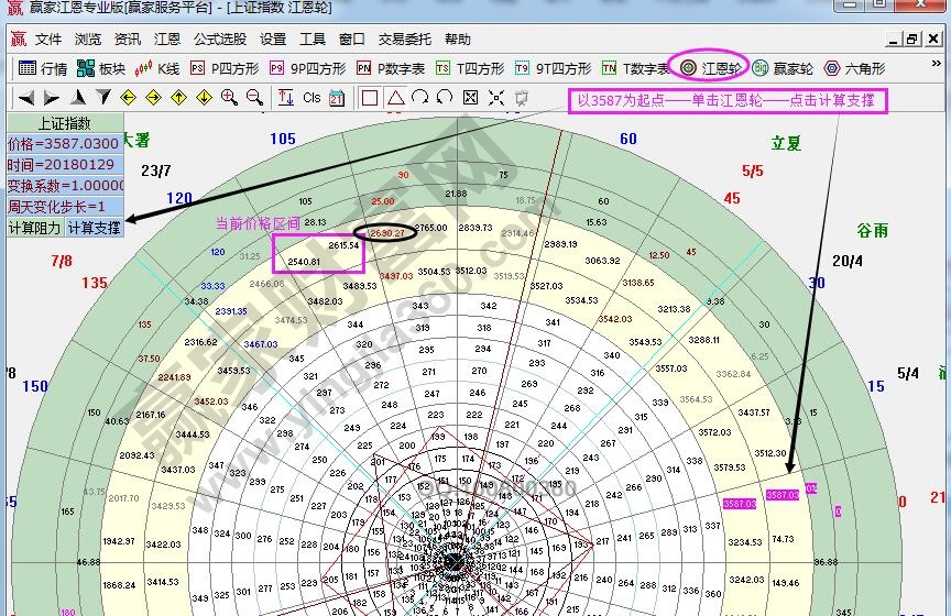 ☆依據(jù)贏家江恩理論系統(tǒng)江恩輪中輪提示:以3587為起點,做江恩輪中輪時空分析圖。當前受阻2615壓力點引發(fā)回落,空間上看將繼續(xù)確認2540點支撐。