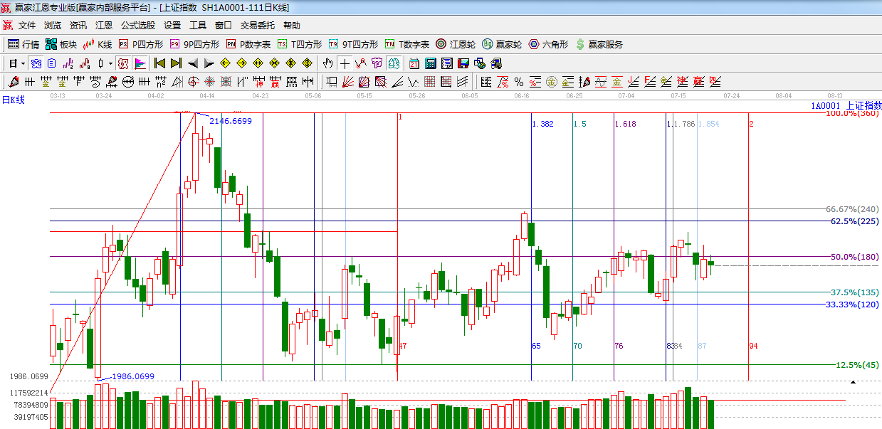 ☆依據贏家江恩系統(tǒng)黃金時間周期線提示:17號窗口收錘頭線,目前指數(shù)走勢并不樂觀,下一時間窗口為7月28日。