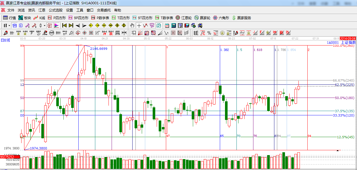 ☆依據(jù)贏家江恩系統(tǒng)波段百分比提示:早盤在權(quán)重的帶動下,攻擊昨天提到的江恩240度位置2089點阻力,隨后高位震蕩整理,明日依然關(guān)注江恩240度,225度阻力。