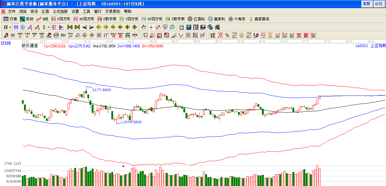江恩看盤綜述:依據(jù)贏家江恩技術(shù)工具分析得出:在權(quán)重的帶動(dòng)下,指數(shù)繼續(xù)強(qiáng)勢(shì)上攻,突破極反通道藍(lán)色外軌線,短期面臨前期頭部2146點(diǎn)阻力,周一留意沖高回落動(dòng)作,7月28日又是前期提到時(shí)間窗口。謹(jǐn)慎留意盤面變化。