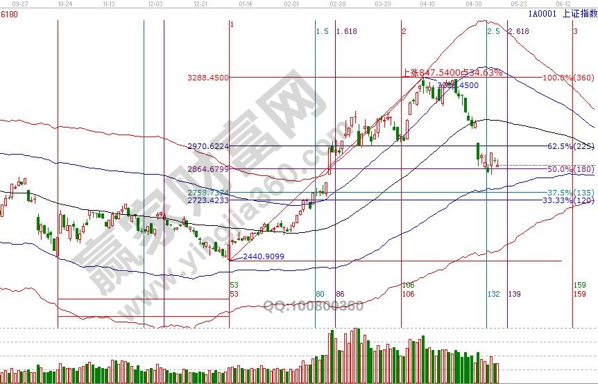 大盤延續(xù)極反通道生命線下弱勢通道運行,按贏家江恩十六字投資真言,時價共振短線反彈信號依然存在,隨著江恩時間窗口臨近,短線又將再度選擇方向,前期的快速下跌,市場需要時間積累能量化解短線壓力,按工具信號開倉的籌碼,要有足夠的耐心和充分的風險控制能力,應對策略可查看14號大勢分析。15號盤中支撐壓力是180度2928點、315度2944點,盤中支撐0度2860點,本周五17號是5月第二個時間窗口。操作策略,指數(shù)擊破黑色生命線,藍色下軌線是回撤目標位,高風險者倉位3-4成,低風險者等待中期參考位。