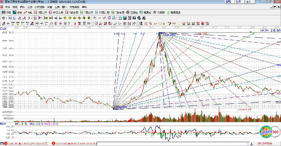 江恩角度線是怎樣的,其實(shí)打開江恩軟件找到角度線的工具,就能夠做出如下圖中的江恩角度線,在作出江恩角度線的之后,就能夠?qū)r(jià)格來進(jìn)行分析了。現(xiàn)在看制作江恩角度線非常方便,但是對(duì)于江恩那個(gè)年代是非常難的,他需要手繪制作,所以也就形成了很多的基準(zhǔn)圖形。