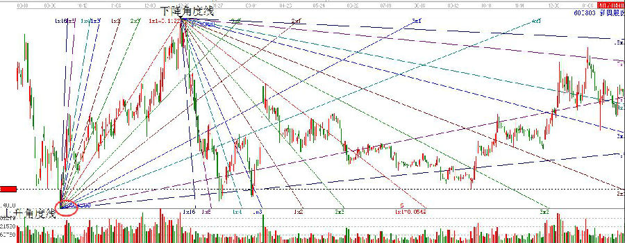 小編強(qiáng)調(diào)一下,45角度線(1*1角度線)是最關(guān)鍵的射線。在角度線的使用中,時(shí)間價(jià)格的起始點(diǎn)定位非常關(guān)鍵,一旦定位錯(cuò)誤,角度線將失去意義。在這里提示大家,單純的上升角度線或單純的下降角度線是不能起到預(yù)測(cè)時(shí)間價(jià)格功能的。只有兩者配合使用才能起到準(zhǔn)確預(yù)測(cè)時(shí)間和價(jià)格的作用,單純的上升或下降角度線只能起到分析趨勢(shì)的功能,如下圖所示。