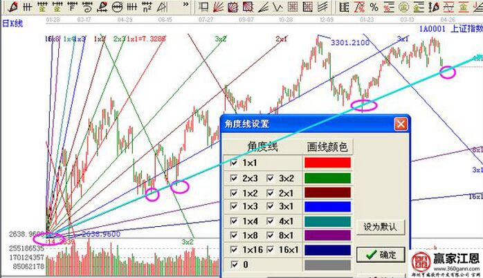 江恩角度線是分上升角度線和下降角度線的,在以每天波動幾個點的上漲速度延伸的,其中1*1角度線是非常重要的,因為這里是多空強勢的分界線,當然除此之外還有的1*2、1*3、1*4、1*8、1*16、2*3、3*2、2*1、3*1、4*1、8*1、16*1、角度線,把市場分割了13個區(qū)域.而角度線在交易中有支撐壓力作用。我們來看下面的上證指數(shù)圖。