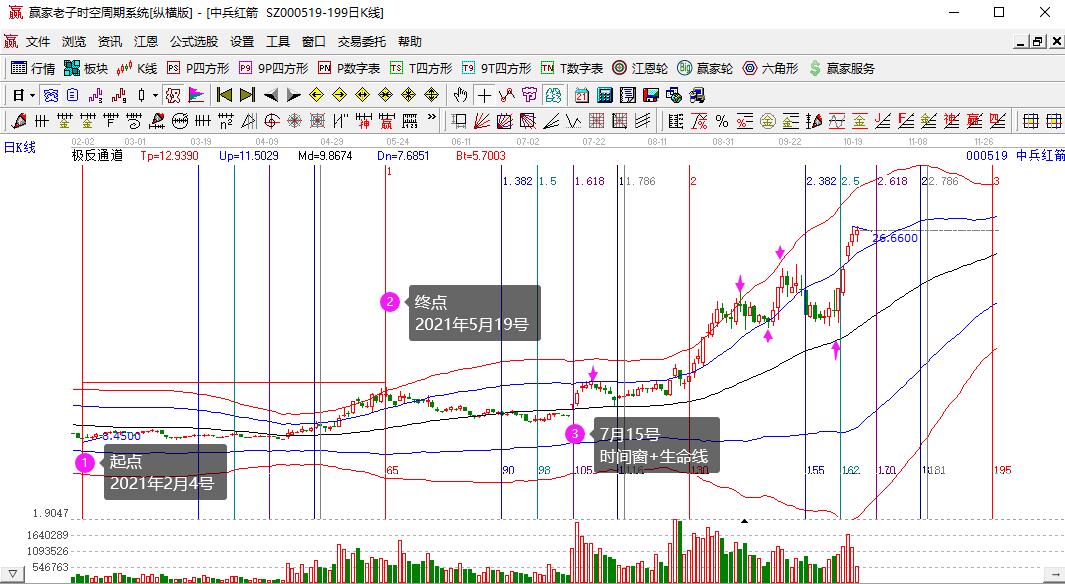如圖,以中兵紅箭000519為例。前期經(jīng)過長期的橫盤蓄勢,該股2021年2月4號進入極度控盤階段,隨后展開一波放量上攻,到達極反通道紅色外軌線遇壓力,進入縮量回落再次清洗浮動籌碼。依據(jù)贏家江恩投資體系時間優(yōu)先原則,通過黃金時間周期線工具進行時間測算,計算洗盤結(jié)束時間,圖中2021年7月15號1.618時間窗口具備了再度攻擊的條件,其一是股價在極反通道黑色生命線位置,其二有江恩時間變盤窗口催化因素,其三量能放量,萬事俱備后該股開始一波趨勢性上攻動作,后續(xù)空間波動符合極反通道漲跌預判規(guī)律,站穩(wěn)一線看高一線,失守一線看低一線。趨勢拐點的把握還要注意多周期協(xié)調(diào),更多細節(jié)聯(lián)系贏家江恩工作人員。