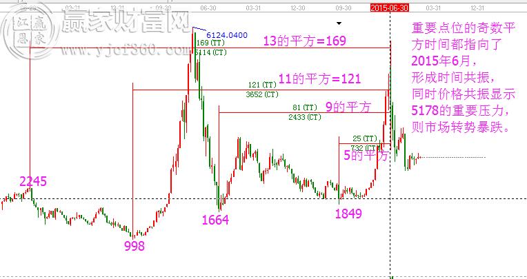 如圖,以上證指數(shù)為例。我們就借助時間尺這一個時間度量工具,來計算市場的時間周期。2245是重要的頂部,998、1664和1849都是非常重要的底部,以這些點位對應(yīng)的日期作為時間的起點,以5178(2015年6月)作為時間的終點,我們可以得到如下數(shù)字。169、121、81、25,分別對應(yīng)13的平方、11的平方、9的平方、5的平方,重要歷史點位的奇數(shù)平方時間都指向了2015年6月,則此月份的時間意義將特別重大。同時,5178的價格共振也顯示了此位置的壓力。如此,市場轉(zhuǎn)勢暴跌。