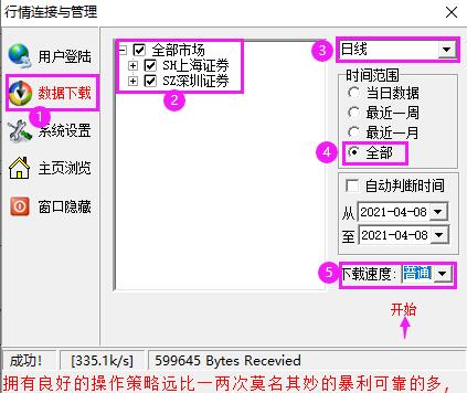雙擊軟件右下角的燈塔圖標,打開【行情連接與管理】,點擊左側(cè)的【數(shù)據(jù)下載】,在【上海證券】和【深證證券】前面的方框打鉤選中,右上角的下載內(nèi)容選擇【日線】,時間范圍選擇【全部】,下載速度選擇【普通】,然后點擊【開始】,直至下載完畢。